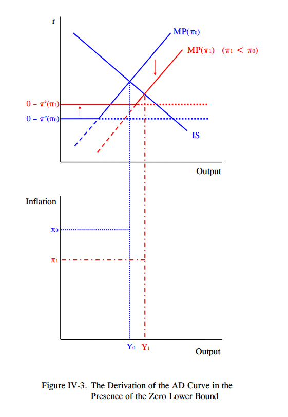 a) Look at Figure IV-3 from the Romer handout. Draw an IS-MP diagram for the IS curve and the MP(π1) curve from that figure. To help draw your figure, assume that inflation expectations πe = π1 > 0, and assume that the IS and MP curves intersect at a real interest rate that is above 0. What is the real interest rate that the central bank sets in equilibrium, and what is the real interest rate that the central bank would like to set if there was no zero lower bound constraint? Label these points in your figure and briefly explain your answer (i.e., why are these points the same or not the same?).