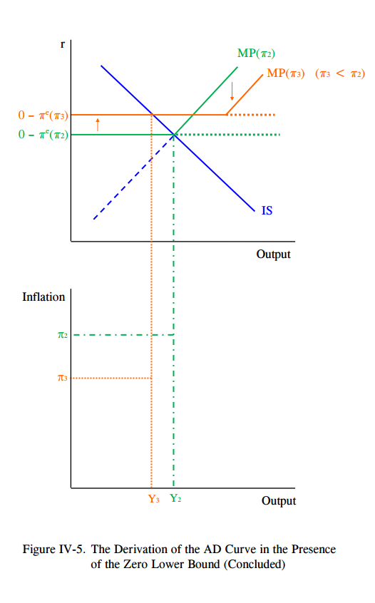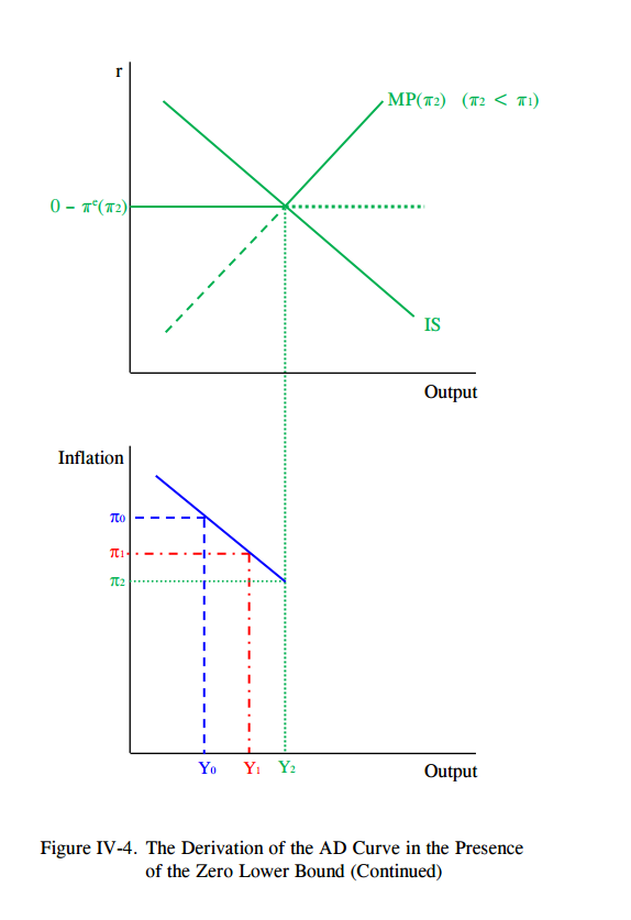 b) Look at Figure IV-4 from the Romer handout. Draw an IS-MP diagram for the IS curve and the MP(π2) curve from that figure. To help draw your figure, assume that inflation expectations πe = π2 > 0, and assume that the IS and MP curves intersect at a real interest rate that is below 0. What is the real interest rate that the central bank sets in equilibrium, and what is the real interest rate that the central bank would like to set if there was no zero lower bound constraint? Label these points in your figure and briefly explain your answer.