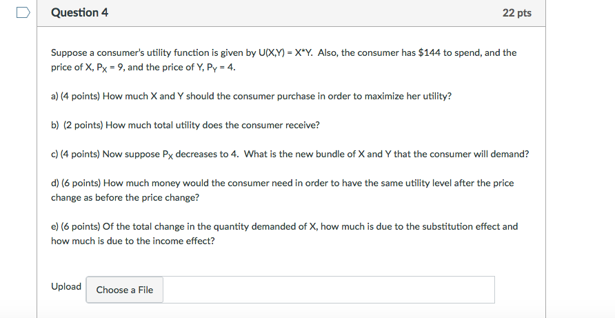 Question 4 22 p1: Suppose a consumer‘s utility function is given by UIXX} = X'Y. Also, the consumer has $144 to spend. and the