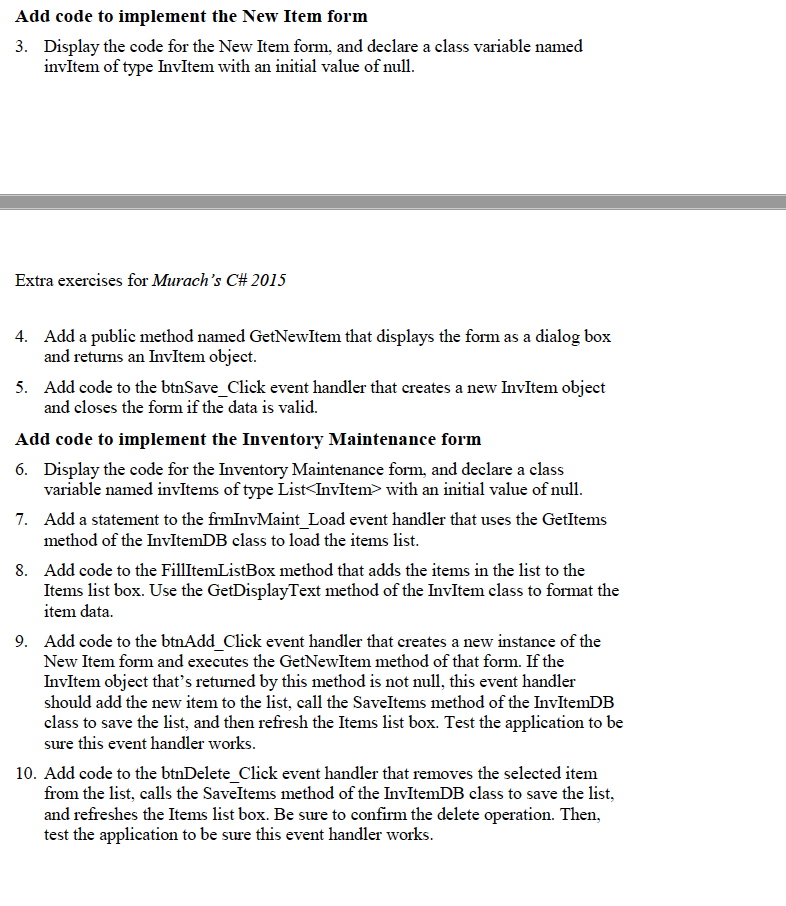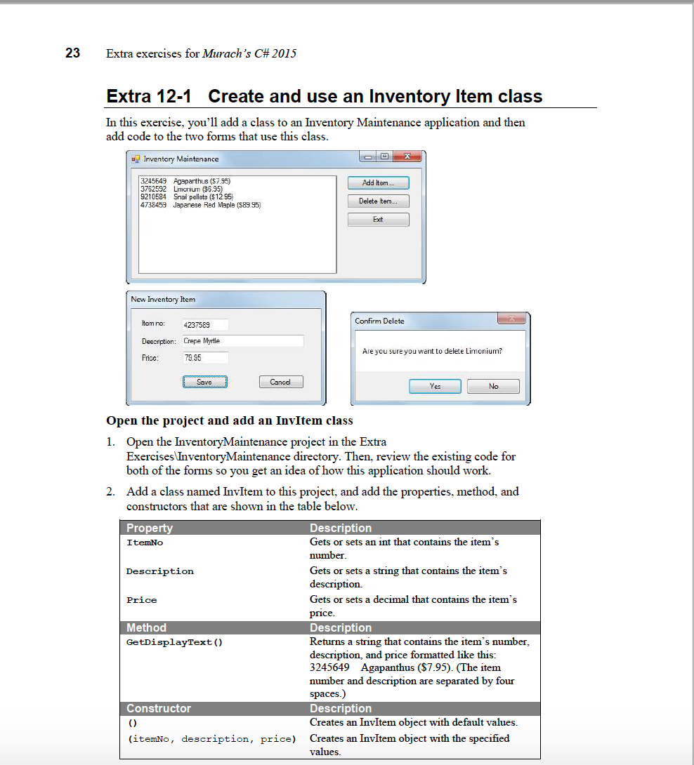 23 Extra exercises for We}! ’3 C# 2015 Extra 12-1 Create and use an Inventory Item class In this exercise, you’ll add a class to an Inventory Maintenance application and then