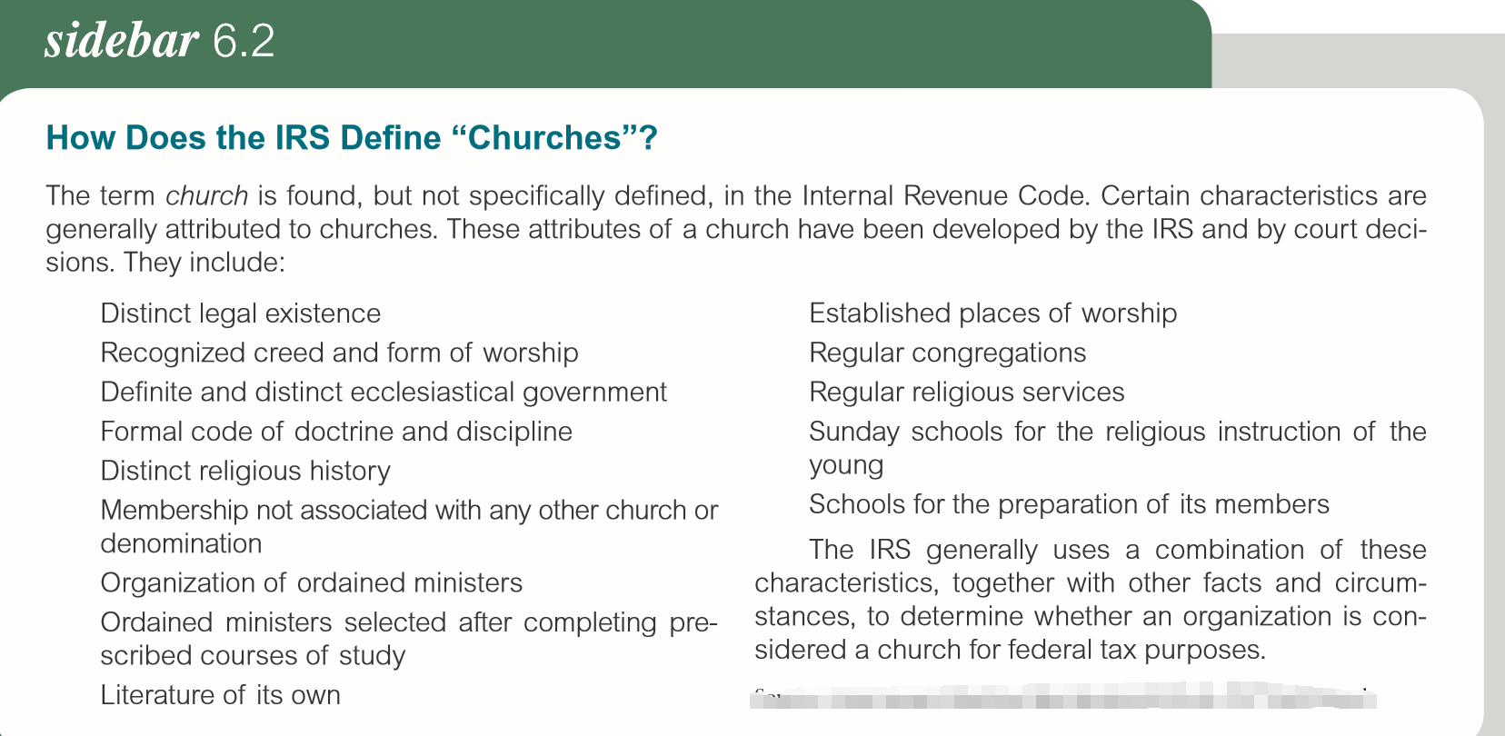 sidebar 6.2 How Does the IRS Define “Churches”? The term church is found, but not specifically defined, in the Internal Revenue Code. Certain characteristics are