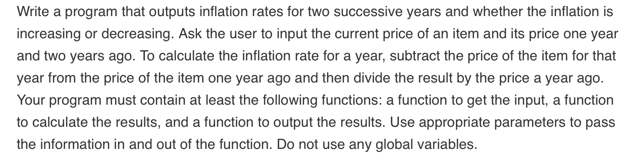 Write a program that outputs inflation rates for two successive years and whether the inflation is
