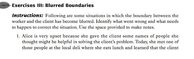 Review the Summers text, pp. 136–138. Choose two hypothetical practice situations under “Blurred Boundaries?” You will respond with your two chosen situations and identify what went wrong with the worker-client boundaries AND what needs to happen to correct the situation. Now, imagine that the client was from a culture, background, ethnicity or country very different from your own. Think about how you might respond differently.