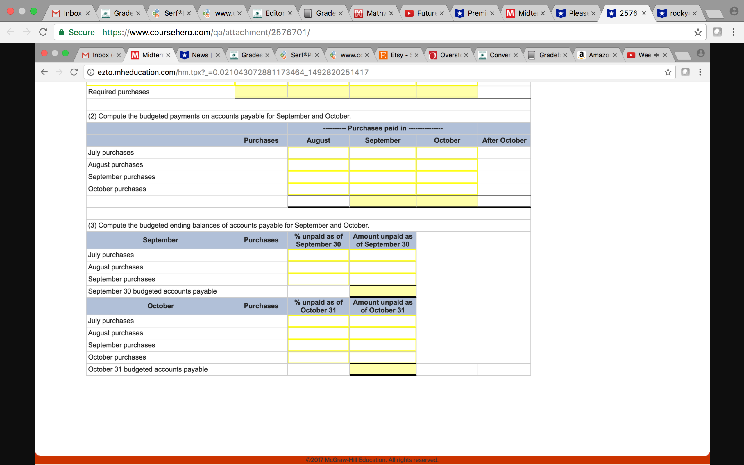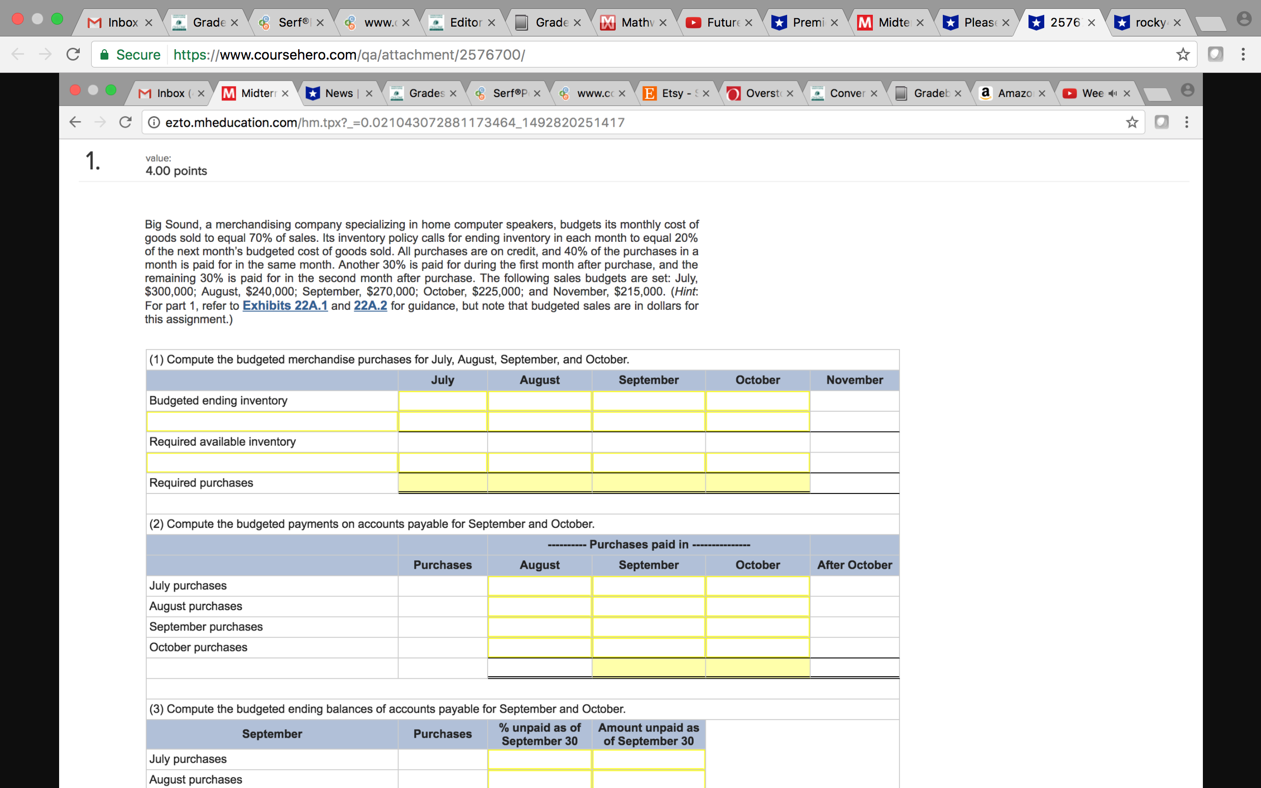 Required available inventory Required purchases (2) Compute the budgeted payments on aocountspayeble for September and October. . 7 July purchases