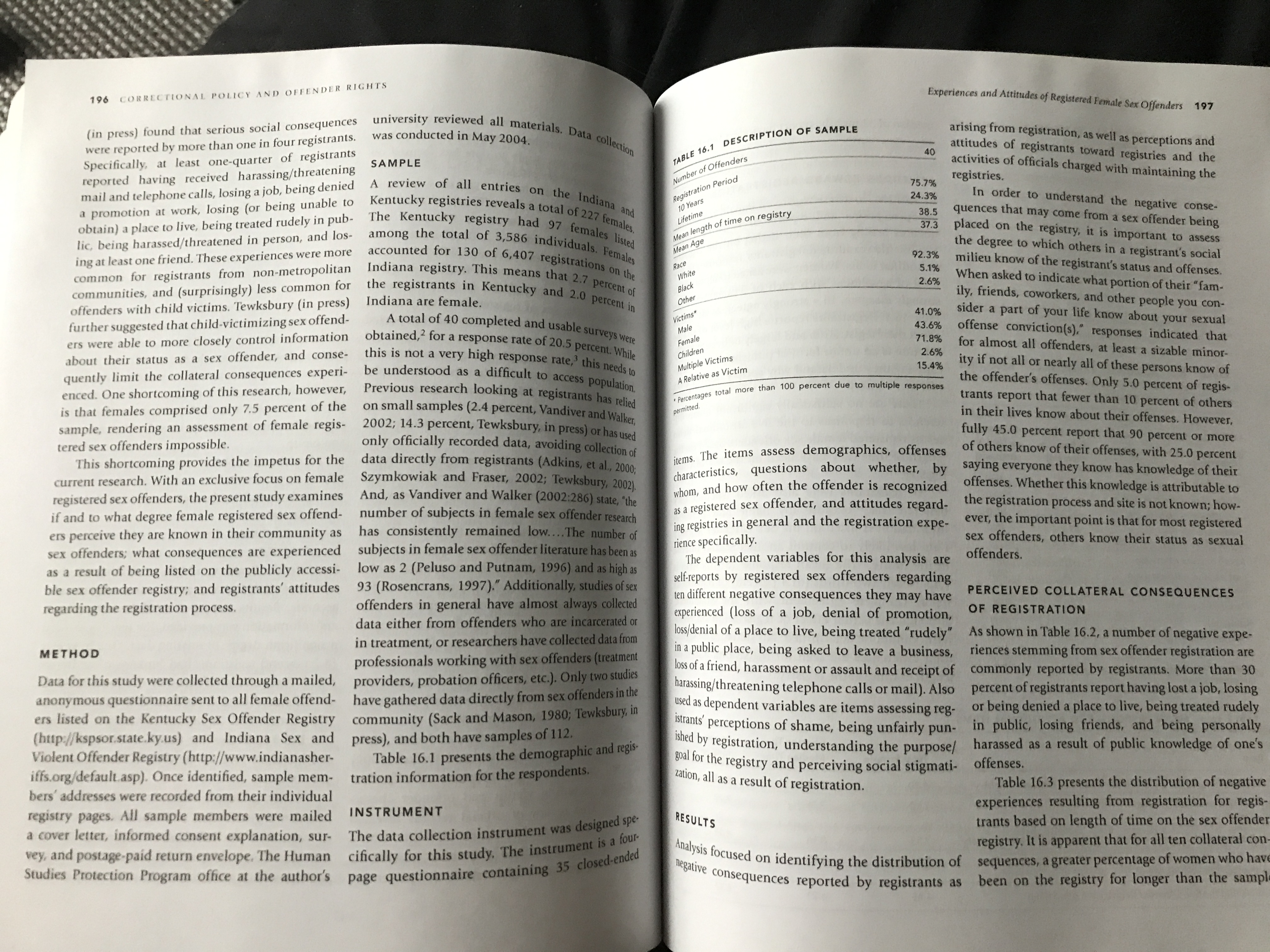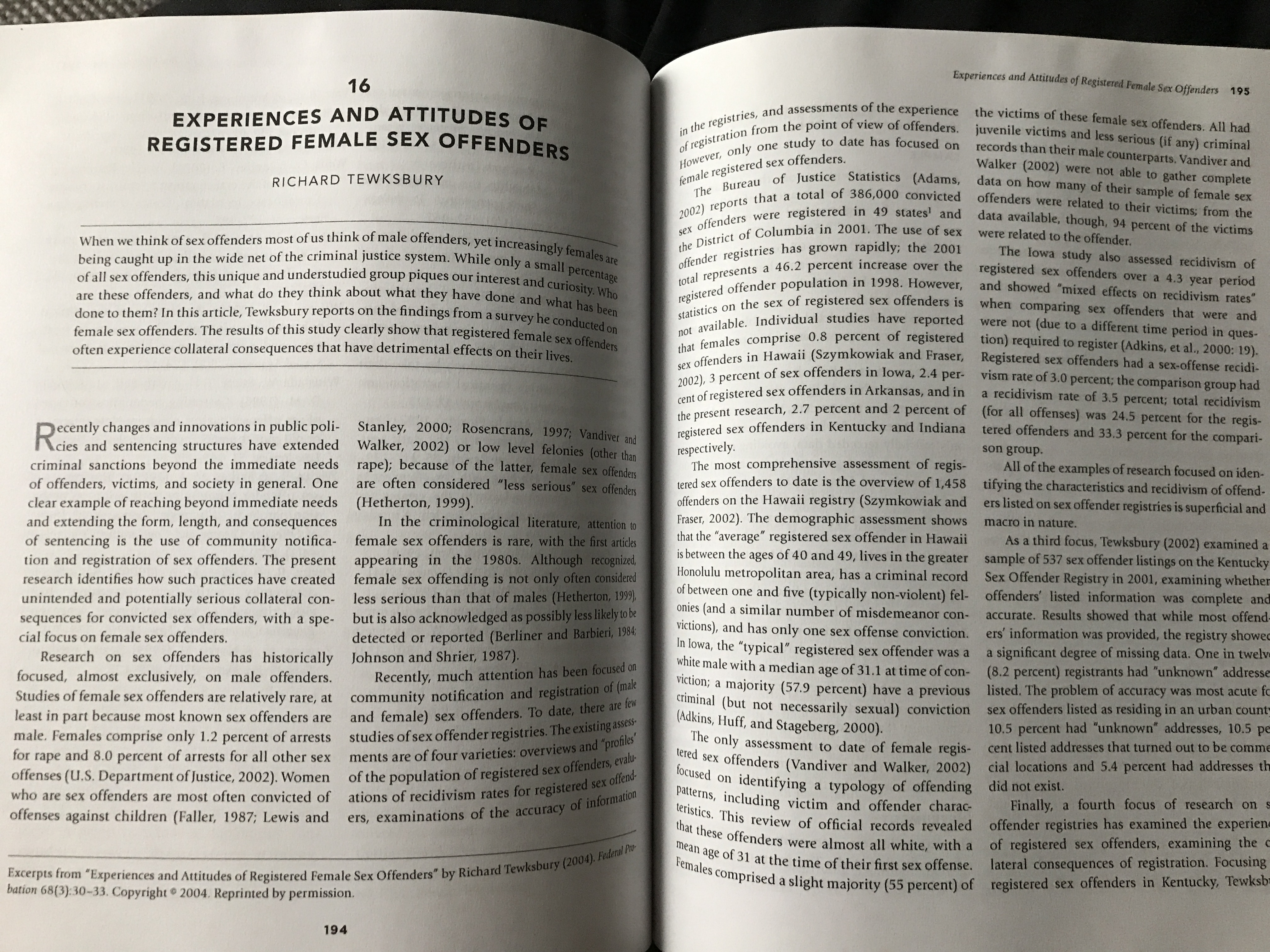 Please read "Experiences and Attitudes of Registered Female Sex Offenders" by Richard Tewksbury beginning on page 194 of your Latessa/Holsinger text. Answer the following questions accordingly. Your responses should be based in what you have read. Please include citations throughout, as well as references in APA format. Your initial post is due by Day 3 (Wednesday). All peer posts are due by Day 7. 1) Consider the statistics provided in the article for female sex offenders. Given the relative proportion of males and females (i.e., pretend they are equal in terms of number of offenders total), do you think sex crimes committed by males or females go underreported more? Why? Again... you are pretending there are an equal number of male and female sex offenders. 2) Tewksbury claims 94% of victims of female sex offenders are related to their perpetrator. Provide reasoning for this phenomenon. 3) Do you believe requiring female sex offenders to register improves public safety? Why or why not? |