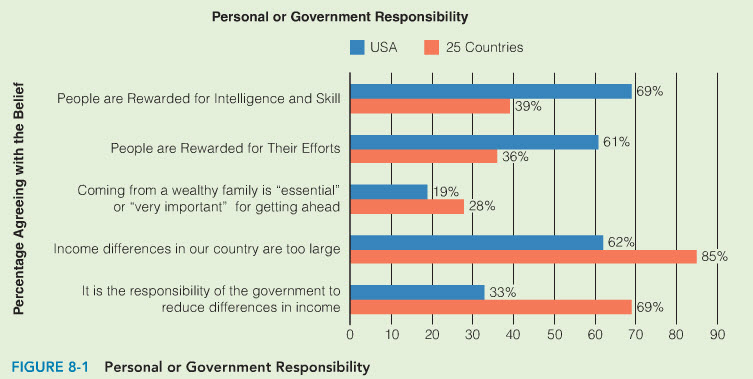 As the above charts indicate, Americans perceive the United States as “the land of opportunity,” a country that allows social mobility and rewards individuals for talent, hard work, and good decisions. However, it is also a country with significant income differences between upper and lower classes.
