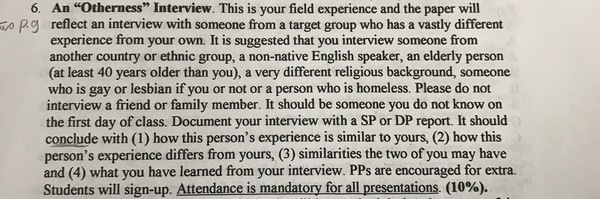 Otherness Presentation I would suggest that you interview someone from another continent or someone 40 years older than you from your country. ( I am girl from Saudi Arabia may u need this information) find the attached to understand what the Professor need in that paper. it will be two pages double space.