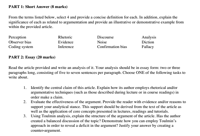 PART 1: Short Answer {3 marks} From the terms listed below, select 4 and provide a concise definition for each- In additicn, explain the significance of each as related to argumentation and provide an illustrative or demonstrative example from
