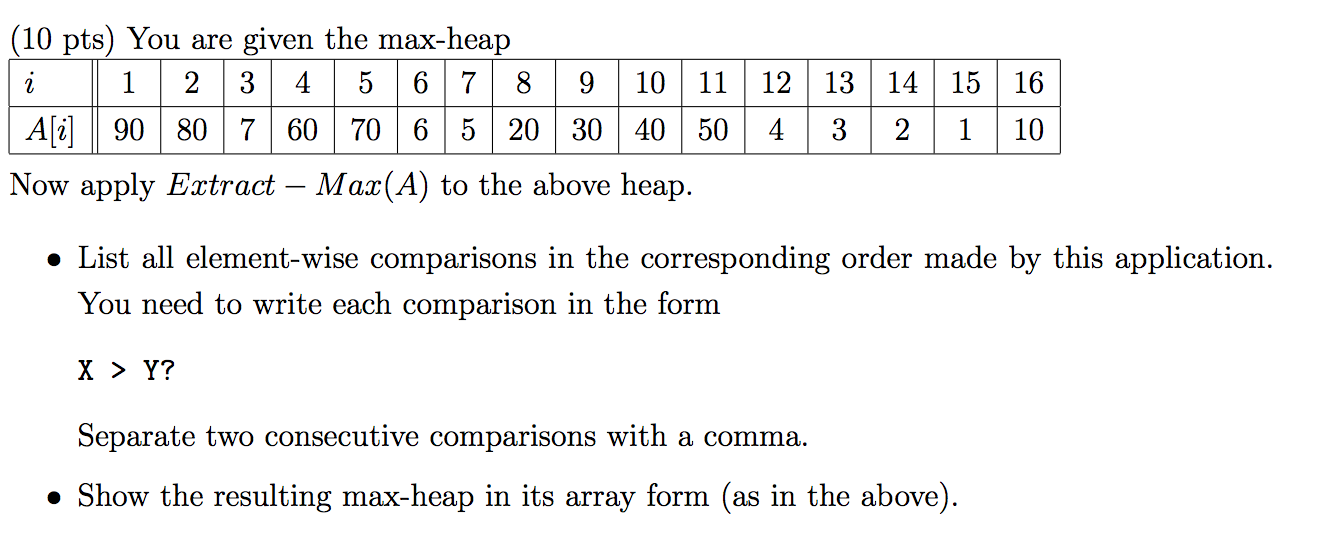 You are given the max-heap (attached) Now apply Extract − M ax(A) to the above heap.• List all element-wise comparisons in the corresponding order made by this application.You need to write each comparison in the formX > Y?Separate two consecutive comparisons with a comma.• Show the resulting max-heap in its array form (as in the above)