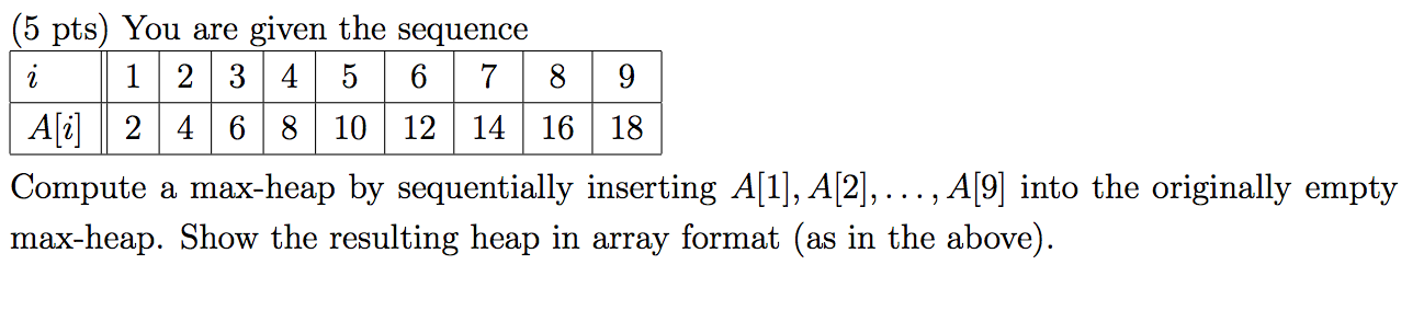 You are given the sequence(attached) Compute a max-heap by sequentially inserting A[1], A[2], . . . , A[9] into the originally empty max-heap. Show the resulting heap in array format (as attached)