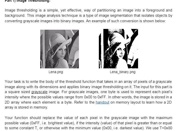 background. This image analysis technique is a type of image segmentation that isolates objects by converting grayscale images into binary images. An example of such conversion is shown below: l 3‘1 Lena.png Lena_binary.png Your task is to write the body of the threshold function that takes in an array of pixels of a grayscale image along with its dimensions and applies binary image thresholding on it. The input for this part is
