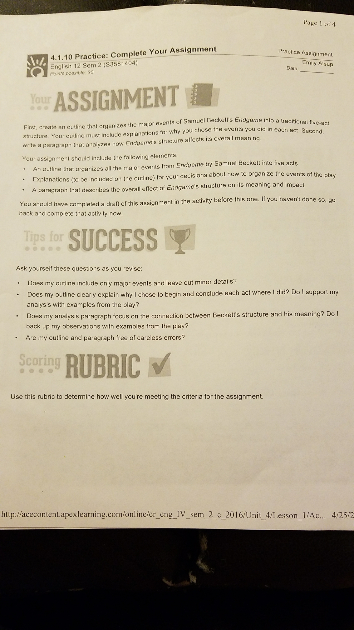 back up my observations with examples from the play? - Are my' outline and paragraph free of careless errors? RUBRIC #7 Use this rubric to determine how well you're meeting the criteria for the assignment. t;- http:lfa'ceconten't.apexIeaming.com/online/cr_eng_lV_sem__2_c_201 6Mnit_4/Lesson_1lAc. .. 4/25/2