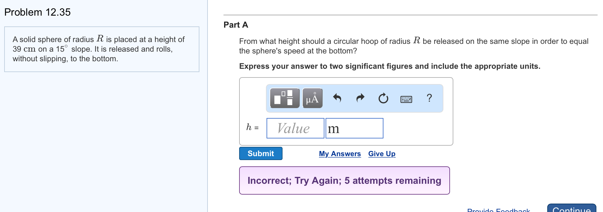 Express your answer to two significant figures and include the appropriate units. h = Value In My Answers Give U}; Incorrect; Try Again; 5 attempts remaining Drnuirln Enndknnll - n n a