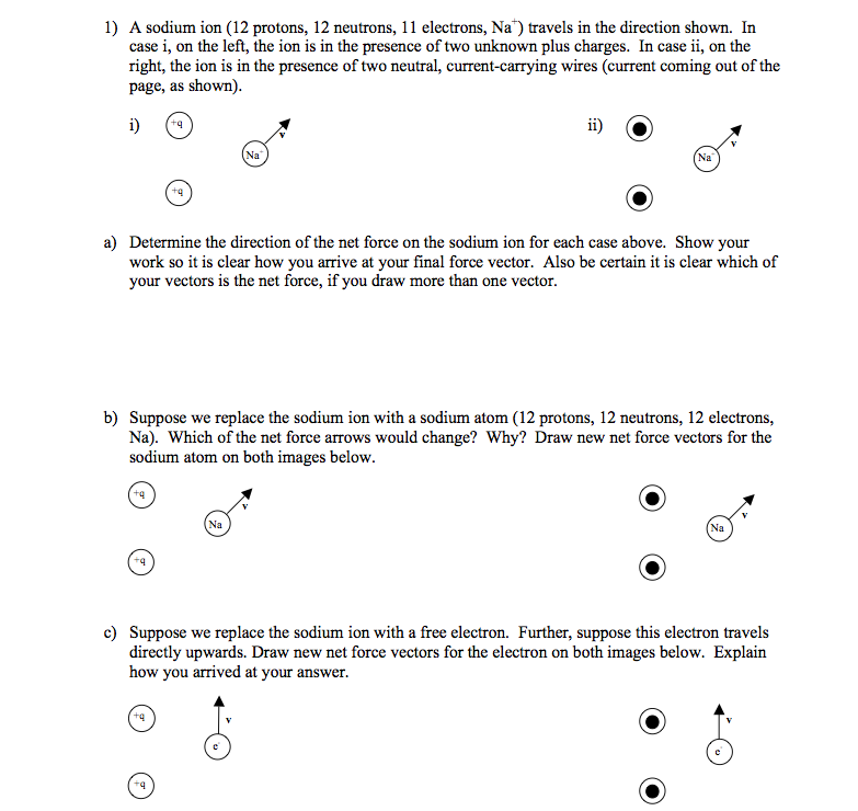 your vectors is the net force, if you draw more than one vector. h] Suppose we replace the sodium ion with a sodium atom (12 protons, 12 neutrons, 12 electrons, Na). Which of the net force arrows would change? Why? Draw new net force vectors for the