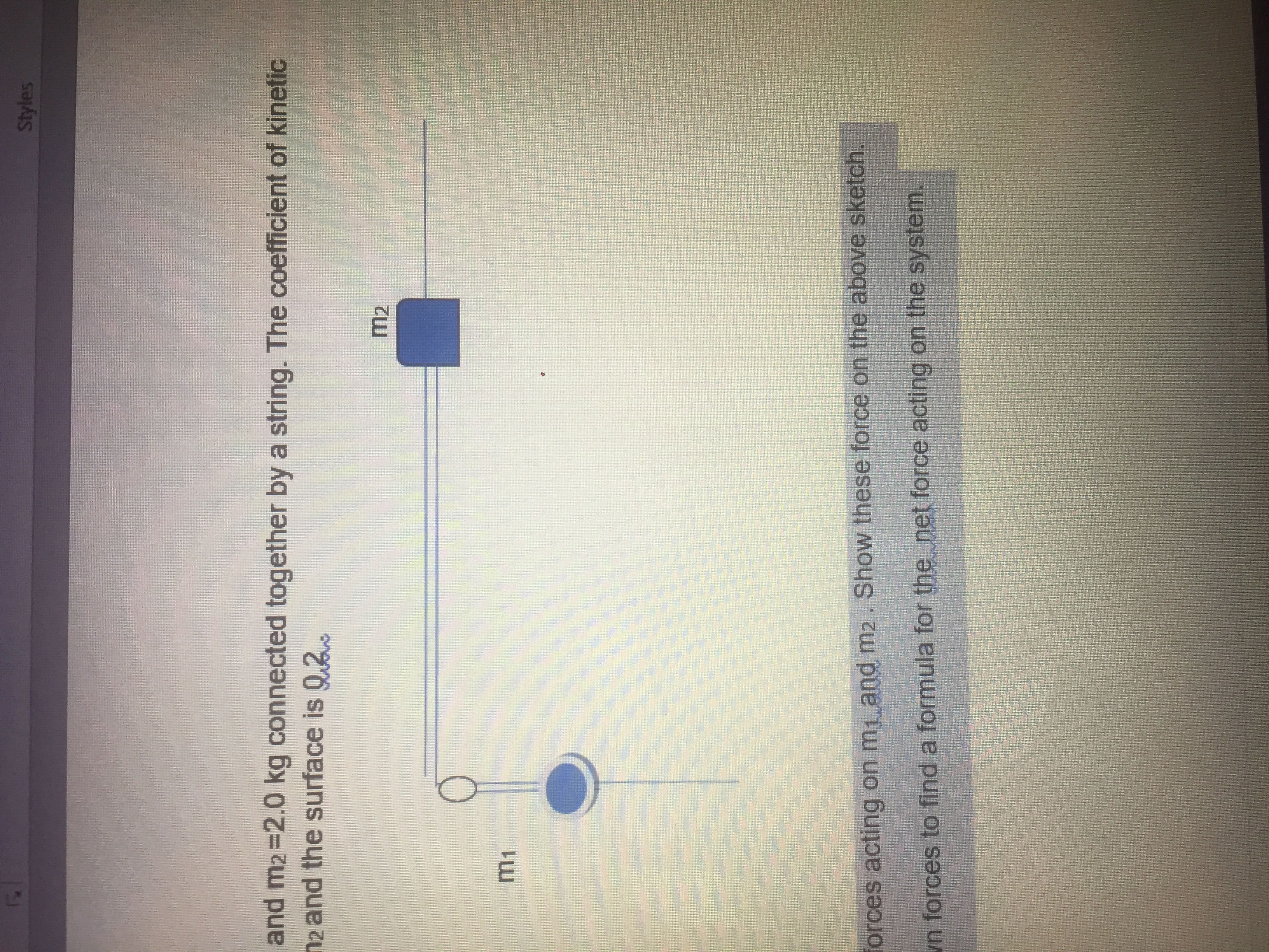 -Block m1Â = 4.0kg and m2Â =2.0 kg connected together by a string. The coefficient of kinetic friction between m2Â and the surface is 0.2 .