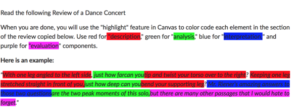 Copy the text below taken from the review and paste it into your discussion forum post labeled Part one. From there use the "highlight" feature to label the elements of a review as demonstrated above. Use the resource Suggested Guidelines for Dance Criticism to help you.There are usually several components of a review not only in each paragraph, but often in a single sentence, so take your time with this.