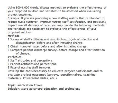 Using 800-1,000 words, discuss methods to evaluate the effectiveness of your proposed solution and variables to be assessed when evaluating project outcomes.
