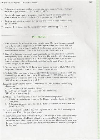 Explain why trade credit is a source of credit for many firms while commercial paper is a source for larger, credit-worthy companies (pp. 520-522). Illustrate how pledging an asset may be used as a source of short-term financing (pp. 522-524). Identify why factoring may be an expensive source of funds (pp. 524-525). Firm A borrows $1 million from a commercial back. The bank charges an annual rate of 10 percent and requires a 3 percent origination fee. How much does the firm have to borrow to have $1 million? Confirm your answer and determine the effective rate of interest. (Assume the loan is outstanding for one year.) Tinker, Inc. finances its seasonal working capital need with short term bank loans. Management plans to borrow $65,000 for a year. The bank has offered the company a 3.5 percent discounted loan with a 1.5 percent origination fee. What are the interest payment and the origination fee required by the loan? What is the rate of interest charged by the bank? You can borrow $5,000 for 60 days with an interest payment of $125. What is the simple rate of interest? What is the compound rate of interest? Stella & Chloe, Inc. needs to borrow $2,000,000 for six months. It can sell 180-day commercial paper with a face value of $2,000,000 for $1,900,000 or borrow the money from a commercial bank at 10 percent. In both cases the interest is $100,000. Which loan is more expensive and why? An individual wishes to borrow $10,000 for a year and is offered the following alternatives: a 10 percent loan discounted in avarice an 11 percent straight loan (i.e., interest paid at maturity). Which loan is more expensive? Which of the following terms of trade credit is the more expensive? A 3 percent cash discount if paid on the 15th day with bill due on the 45th day (3/15, net 45) A 2 percent cash discount if paid on the 10th day with the bill due on the 30th day (2/10, net 30) Trade credit may be stated as n60 plus 18 percent on the balance outstanding after two months. What is the cost of this credit? Dash Construction needs to borrow $200,000 for 45 days in order to take advantage of the cash discount of 3/10, n55 offered by a supplier. Dash Construction can borrow the funds from a bank with an interest payment of $5,000 at the maturity of the loan. Should managementÂ