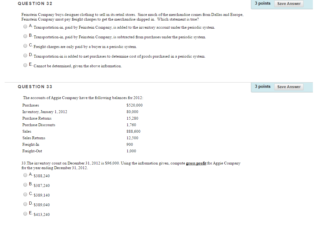 QUESTION 32 ‘ Spoims SaveAnswer Feinstein Company buys designer clothing to sell in its retail stores. Since much ofthe merchandise comes fiom Dallas and Europe,