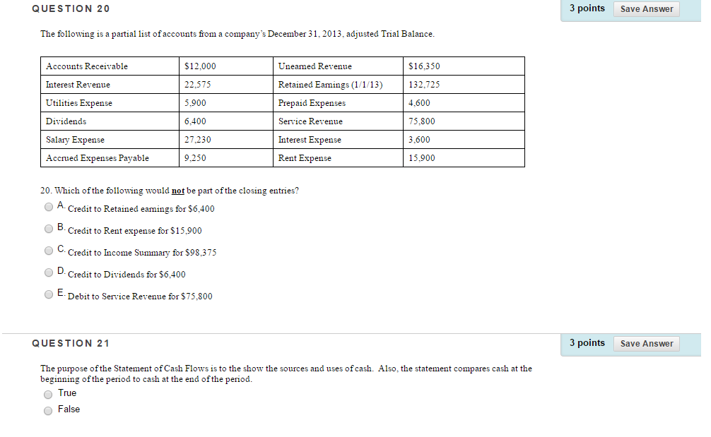 QUESTION 20 Sip-aims SaveAnswer The following is a partial list ofaccounts fi'om a company‘s December 31, 2013 , adjusted Trial Balance. Accounts Receivable $ 12,000 Unearned Revenue $163 30