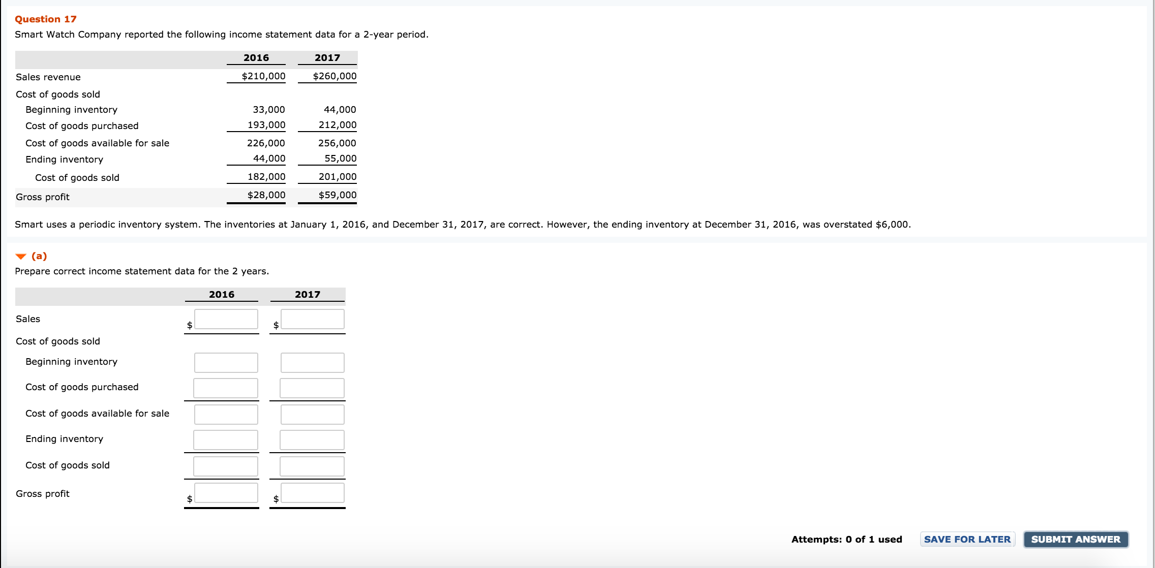 Gross profit $28,000 $59,000 Smart uses a periodic inventory system. The inventories at January 1, 2015, and December 31, 2017, are correct. However, the ending inventory at December 31, 2016, was overstated $6,000.