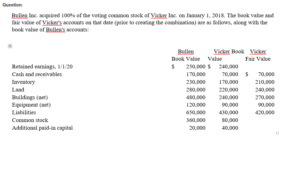 1) Assume that Bullen paid a total of $480,000 in cash for all of the shares of Vicker. In addition, Bullen paid $35,000 for secretarial and management time allocated to the acquisition transaction. What will be the balance in consolidated goodwill?Â