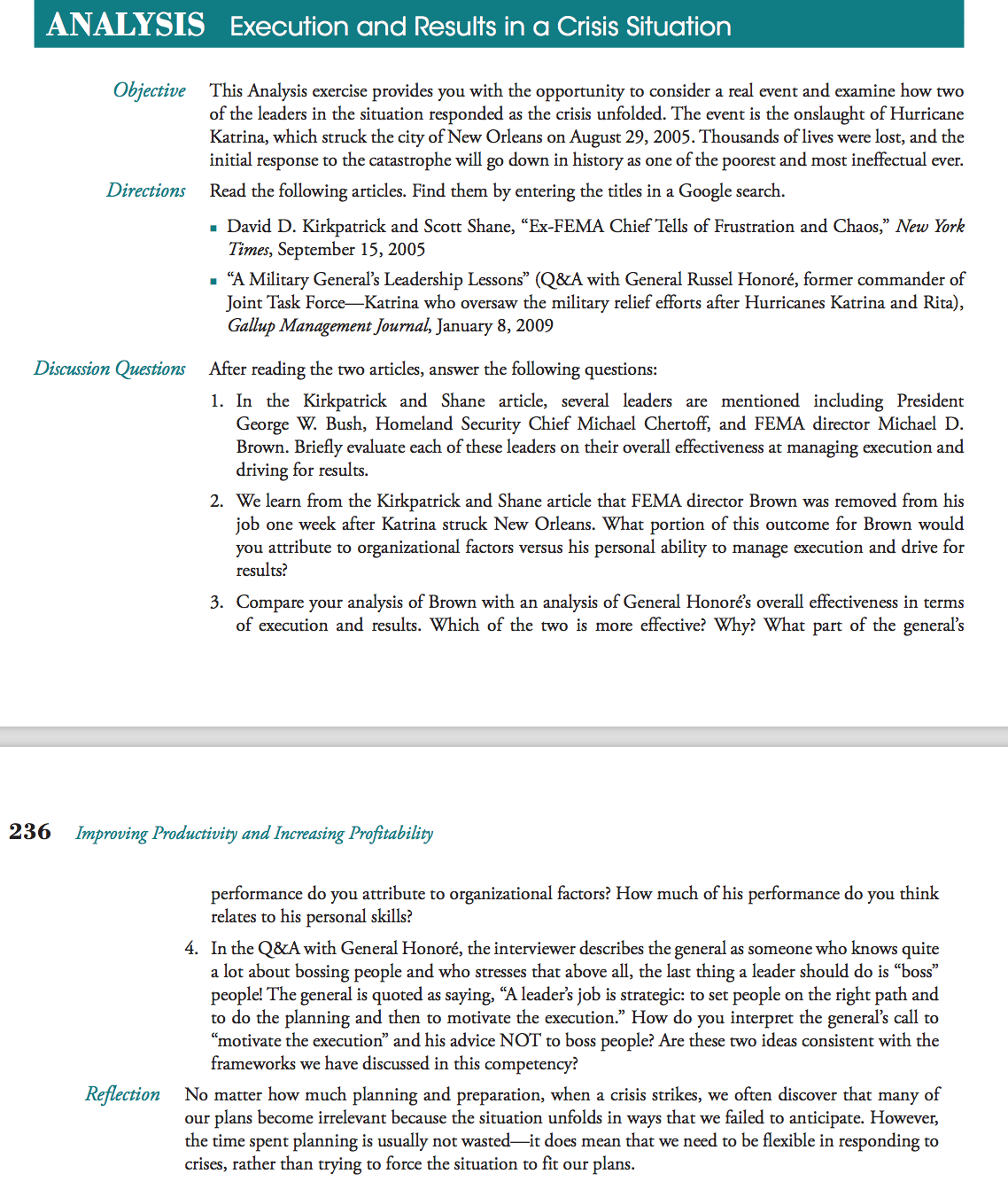 Objective: This Analysis exercise provides you with the opportunity to consider a real event and examine how two of the leaders in the situation responded as the crisis unfolded. The event is the onslaught of Hurricane Katrina, which struck the city of New Orleans on August 29, 2005. Thousands of lives were lost, and the initial response to the catastrophe will go down in history as one of the poorest and most ineffectual ever.