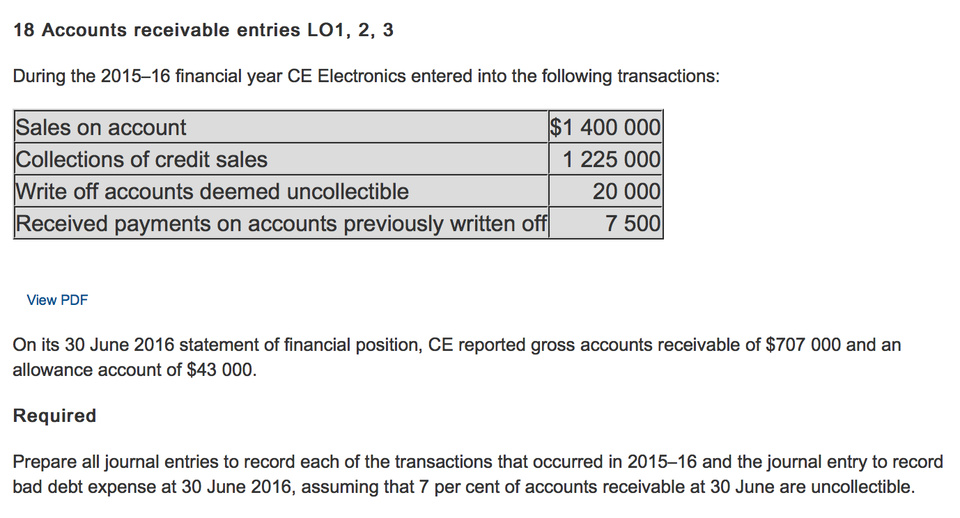 18 Accounts receivable entries L01, 2, 3 During the 2015—16 financial year CE Electronics entered into the following transactions: — 400 000