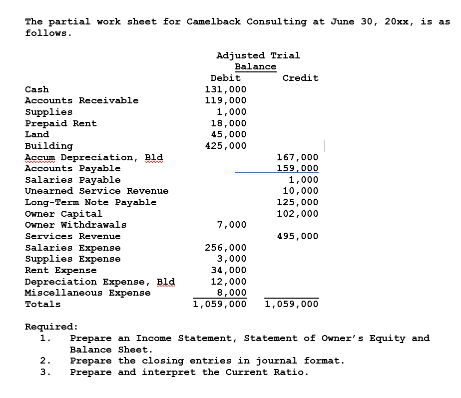 2. Prepare the closing entries in journal format. 3. Prepare and interpret the Current Ratio.