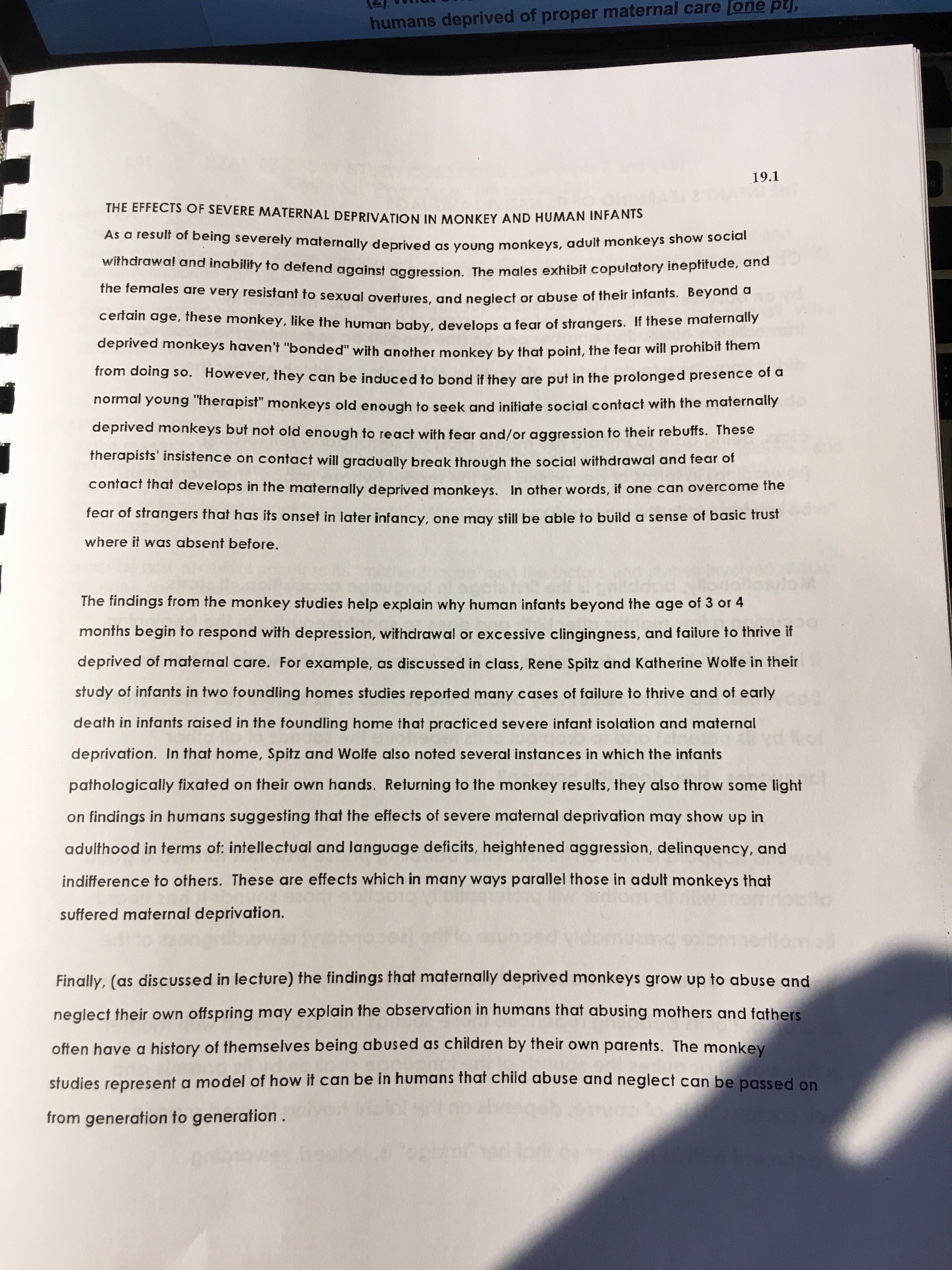 (4) What light do the monkey studies shed on the origins of child abuse in human society. [two pts]