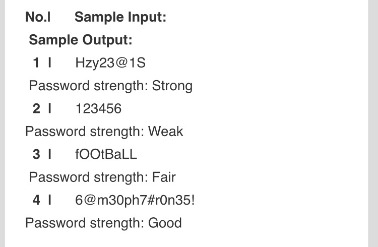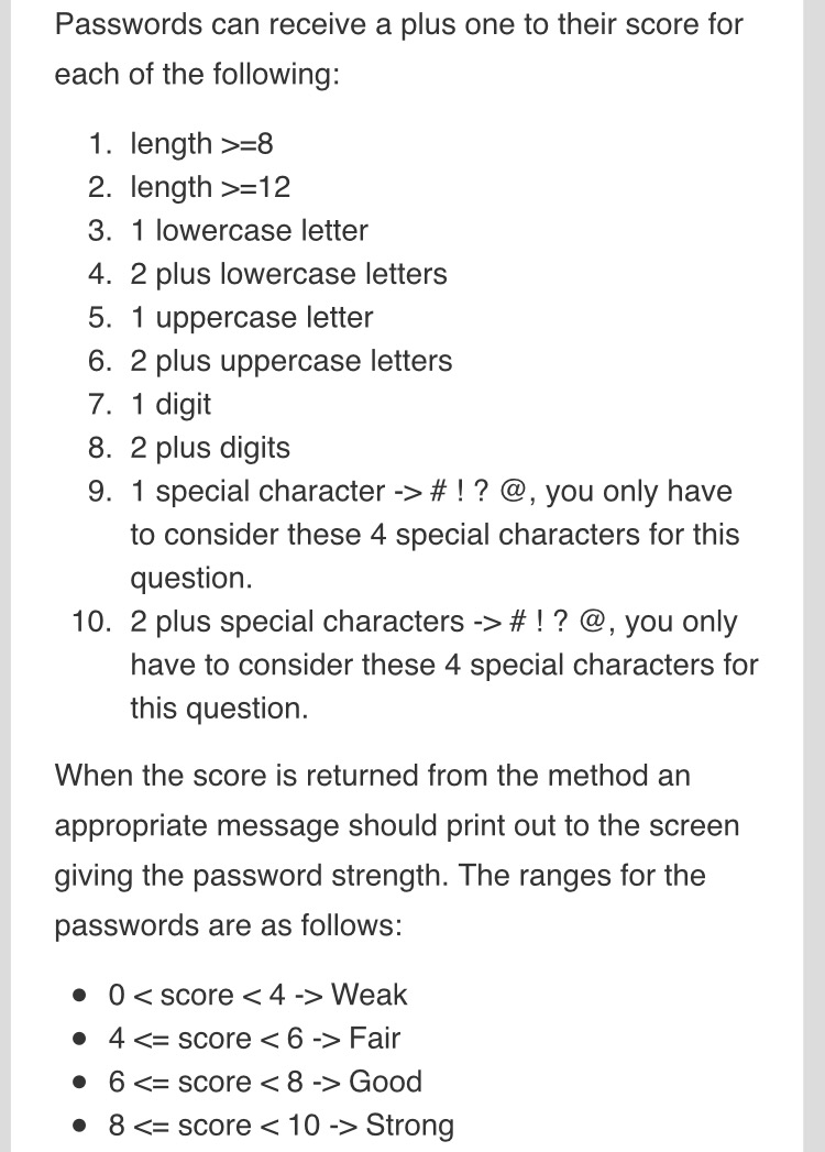 this question. When the score is returned from the method an appropriate message should print out to the screen giving the password strength. The ranges for the passwords are as follows: 0 < score < 4 -> Weak 4 <= score <1 6 -:> Fair 6 <= score «a: 8 -:> Good 8 <= score <: 10 -> Strong