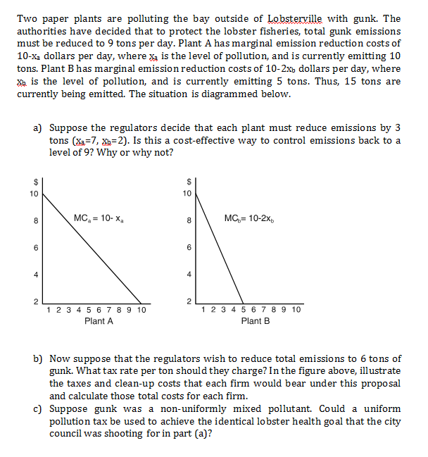 must be reduced to '9 tons per day. Plant Ahas marginal emission reduction costs of ‘lfl-xa dollars per day, where g; is the level of pollutio n, and is currently emitting 1D