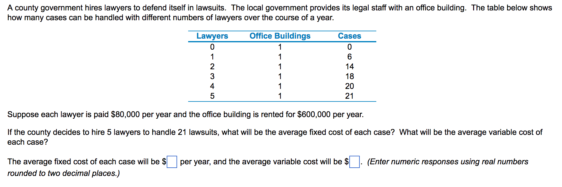 AAAAAA Suppose each lawyer is paid $80,000 per year and the office building is rented for $600,000 per year. If the county decides to hire 5 lawyers to handle 21 lawsuits, what will be the average fixed cost of each case? What will be the average variable cost of