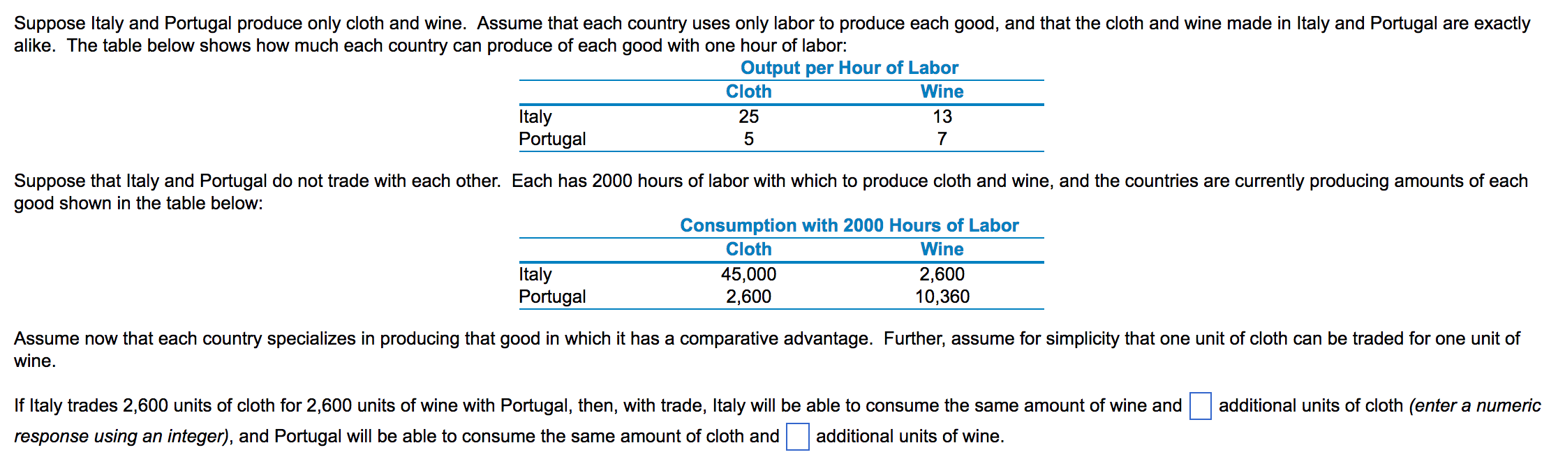 Portugal 2,600 10,360 Assume now that each country specializes in producing that good in which it has a comparative advantage. Further, assume for simplicity that one unit of cloth can be traded for one unit of wine. If Italy trades 2,600 units of cloth for 2,600 units of wine with Portugal, then, with trade, Italy will be able to consume the same amount of wine and response using an integer), and Portugal will be able to consume the same amount of cloth and additional units of wine. additional units of cloth (enter a numeric