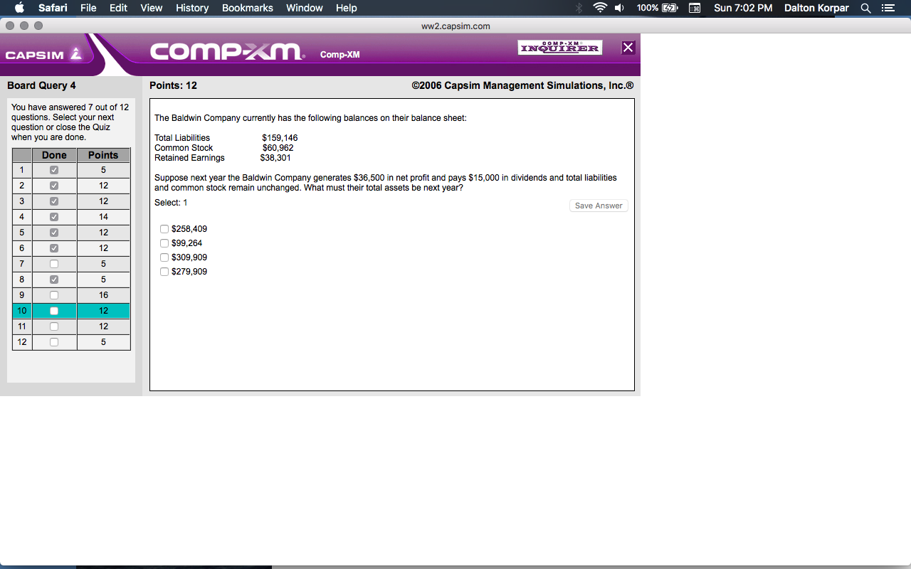 E 12 12 IDDIDHDHEHEHH View Historyt Bookmarks Window Help m2.capslm.corn Points: 12 @2006 63le Management Simulaflons, Imam Sun TU" PM Dalton Korpar The Baan Company currently has the following balances on their balance sheet Total Llflhllififi $159,146