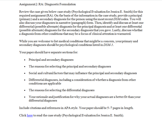 Review the case study (Psychological Evaluation for Jessica E. Smith) in the attachment. provide a principal (primary) and a secondary diagnosis for the person using the most recent DSM codes in 5-7 pages with reference page. Use case study and other attachment for guidance for paper.