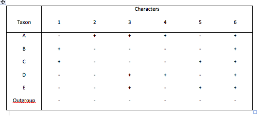 a.          Build the most parsimonious tree for taxa A through E and the outgroup based on Characters 1-6. Make sure to label all characters on your tree.