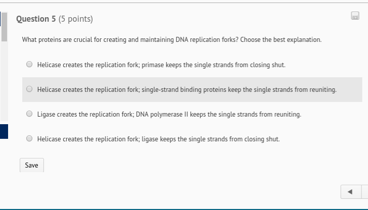 Question 5 [5 points] What proteins are crucial for creating and mainiaining DNh replication forks? Choose the best uplanation. C" Helicase creates the replication fork; primase keeps the single strands from closing shut. Ci Helicase creates the replication fork; singlestrand hilding proteins keep the single shands {mm reuniting. Cl Ligase creates the replication fork; DNA polymerase ii keeps the single strands from reun'rljng. CI Helicase creates the replication fork; ligase keeps the single strands from closing shut ISar-rel