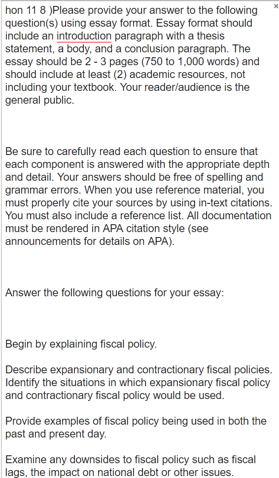 announcements for details on APA). Answer the following questions for your essay: Begin by explaining fiscal policy. Describe expansionary and contractionary fiscal policies. Identify the situations in which expansionary fiscal policy