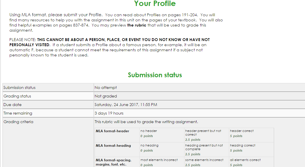 MLA format-spacing, most elements incorrect some elements incorrect aI elements correct margins. font. ete- 0 points 2.5 points 5 points