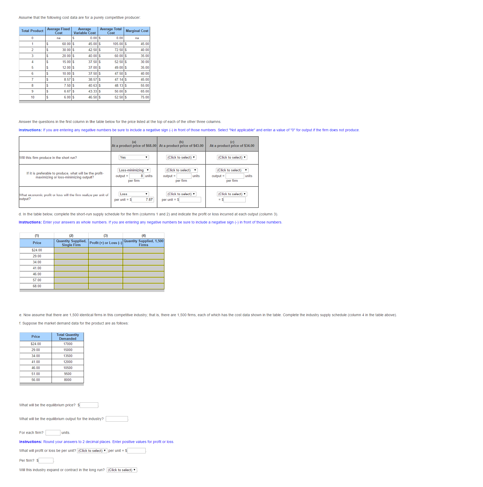 — e, New assume lnal there are 1,500 IdenlIcal firms In this campefilnre induslly; mat is, mere are 1,500 firms, each afwnicn naslne casl dala shown in me lable Complete llle industry supply schedule (column 4 in llle lable above) I Suppose the markel demand dala lur Ine praducl are as lallpws: $211.00 17000