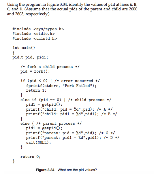 #include <sys/types.h> #include <stdio.h> #include <unistd.h> int main() { pid_t pid, pid1; Â Â Â /* fork a child process */ Â Â Â pid = fork(); Â Â Â if (pid < 0) { /* error occurred */ Â Â Â Â Â Â Â fprintf(stderr, "Fork Failed"); return 1; Â Â Â Â }else if (pid == 0) { /* child process */ pid1 = getpid(); Â Â Â Â Â Â Â printf("child: pid = %dn",pid); /* A */ Â Â Â Â Â Â Â printf("child: pid1 = %dnn",pid1); /* B */ Â Â Â }else { /* parent process */ Â Â Â Â Â Â Â pid1 = getpid(); Â Â Â Â Â Â Â printf("parent: pid = %dn",pid); Â Â Â Â Â Â Â /* C */ printf("parent: pid1 = %d n",pid1); /* D */ Â Â Â Â Â Â Â wait(NULL); Â Â Â } Â Â Â return 0; } |