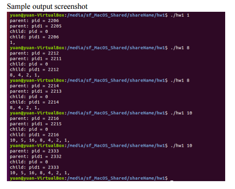 1. Besides requirements in the Problem, your program should also display the process IDs of both the parent and child processes. Follow the code in Figure 3.34 to structure your program and to print the process IDs. Capture a screenshot after running your program. A sample screenshot is provided below (the output of your program should have the same structure as in the sample screenshot).