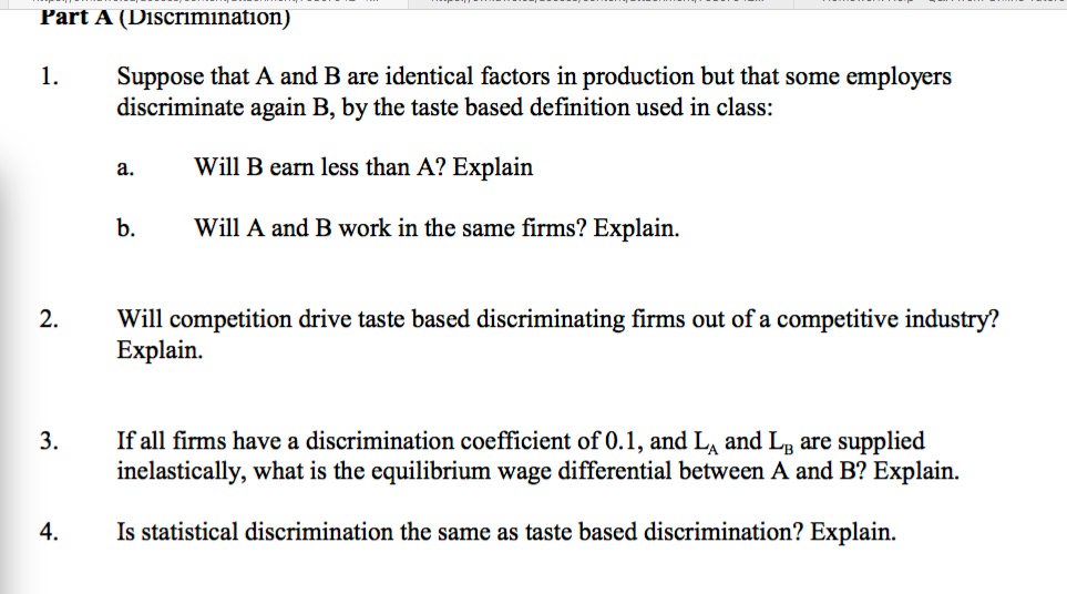 discriminate again B, by the taste based definition used in class: a. Will B earn less than A? Explain