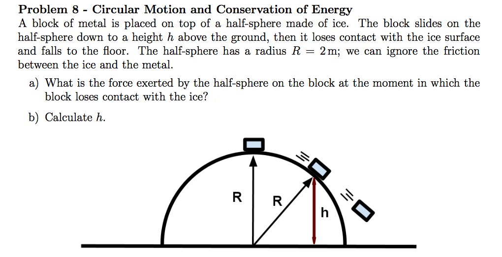 A block of metal is placed on top of a half-sphere made of ice. The block slides on the half-sphere down to a height h above the ground, then it loses contact with the ice surface