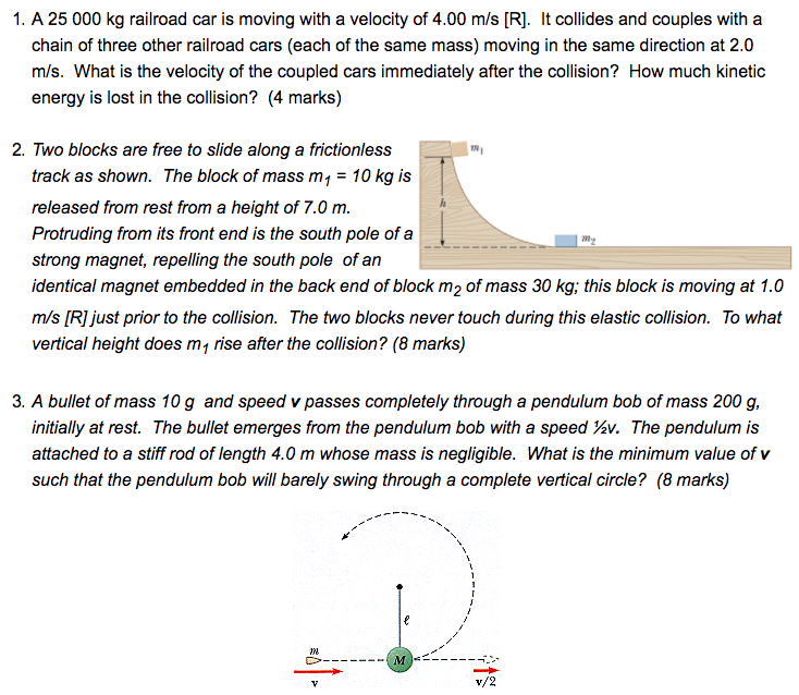 1. A 25 DDD kg railroad car is moving with a velocity of 4.UD mls [R]. It collides and couples with a