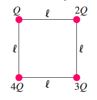 to the other? 15. (ll) At each corner of a square of side IE there are point charges of magnitude IE2. 20, 30, and 40
