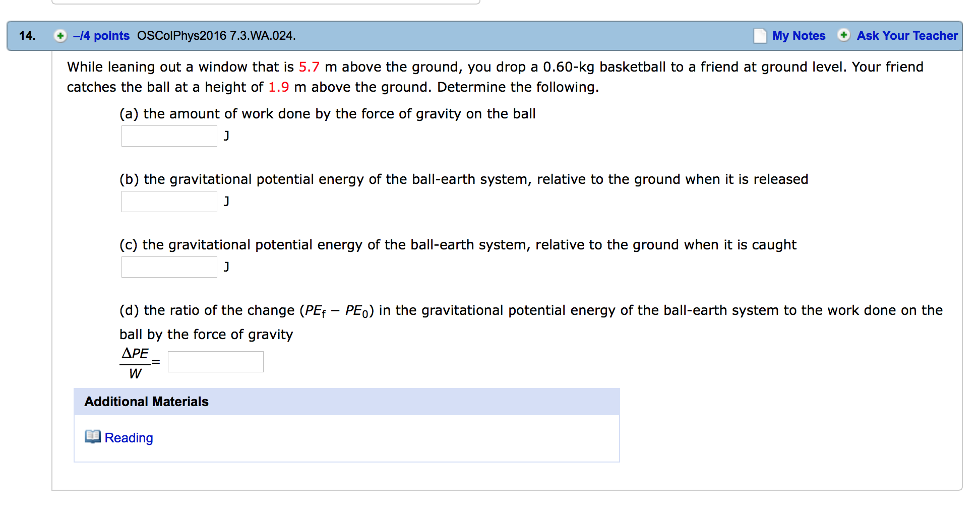 catches the ball at a height of 1.9 m above the ground. Determine the following. (a) the amount of work done by the force of gravity on the ball