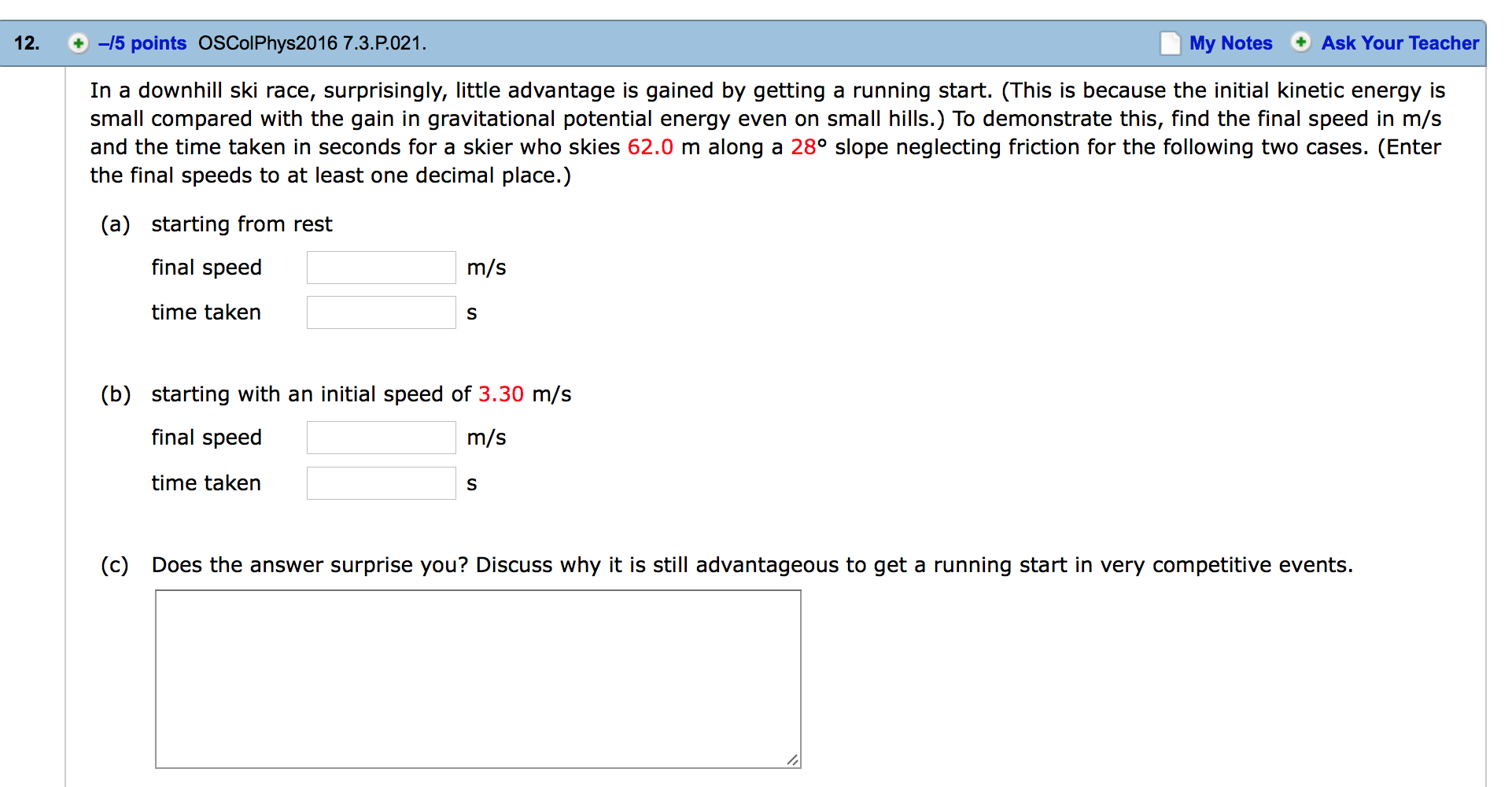 the final speeds to at least one decimal place.) (a) starting from rest final speed time taken (b) starting with an initial speed of 3.30 m/s final speed time taken (c) Does the answer surprise you? Discuss why it is still advantageous to get a running start in very competitive events. m/s 5 m/s 5