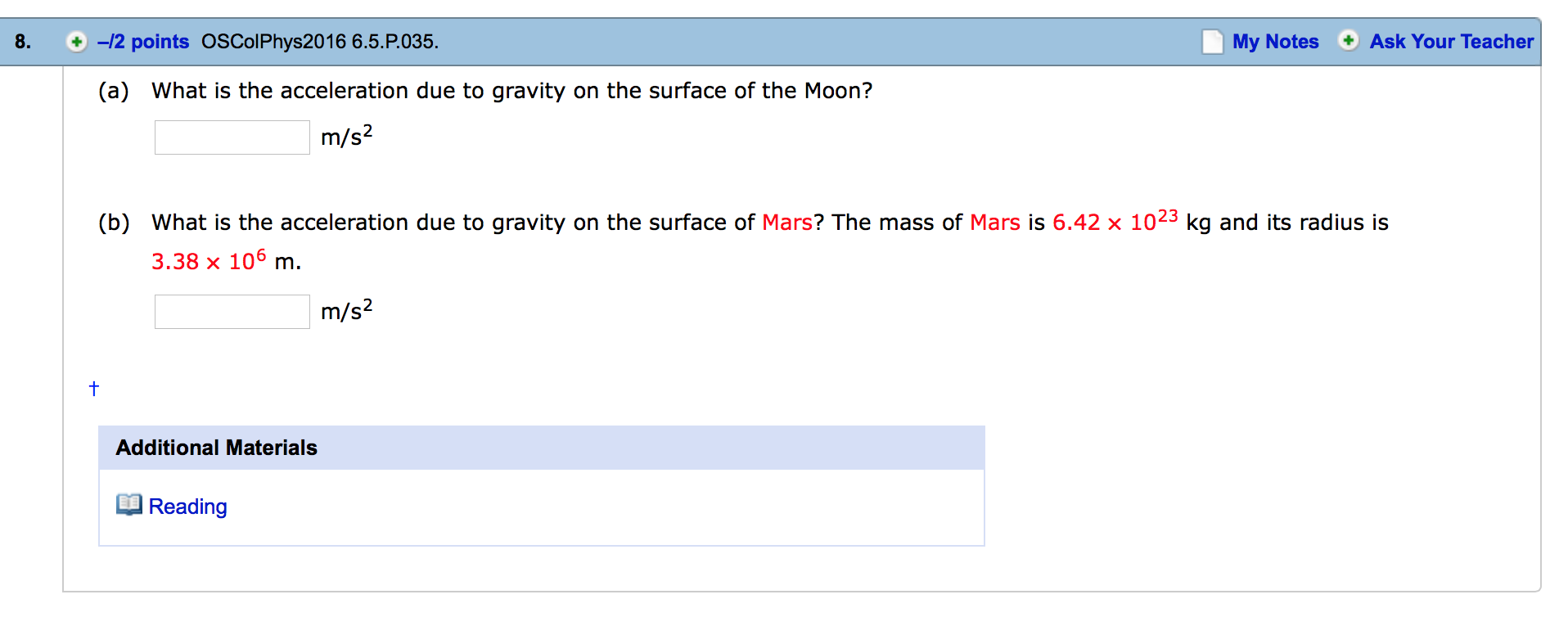 (a) What is the acceleration due to gravity on the surface of the Moon? m/s2 (b) What is the acceleration due to gravity on the surface of Mars? The mass of Mars is 6.42 x 1023 kg and its radius is